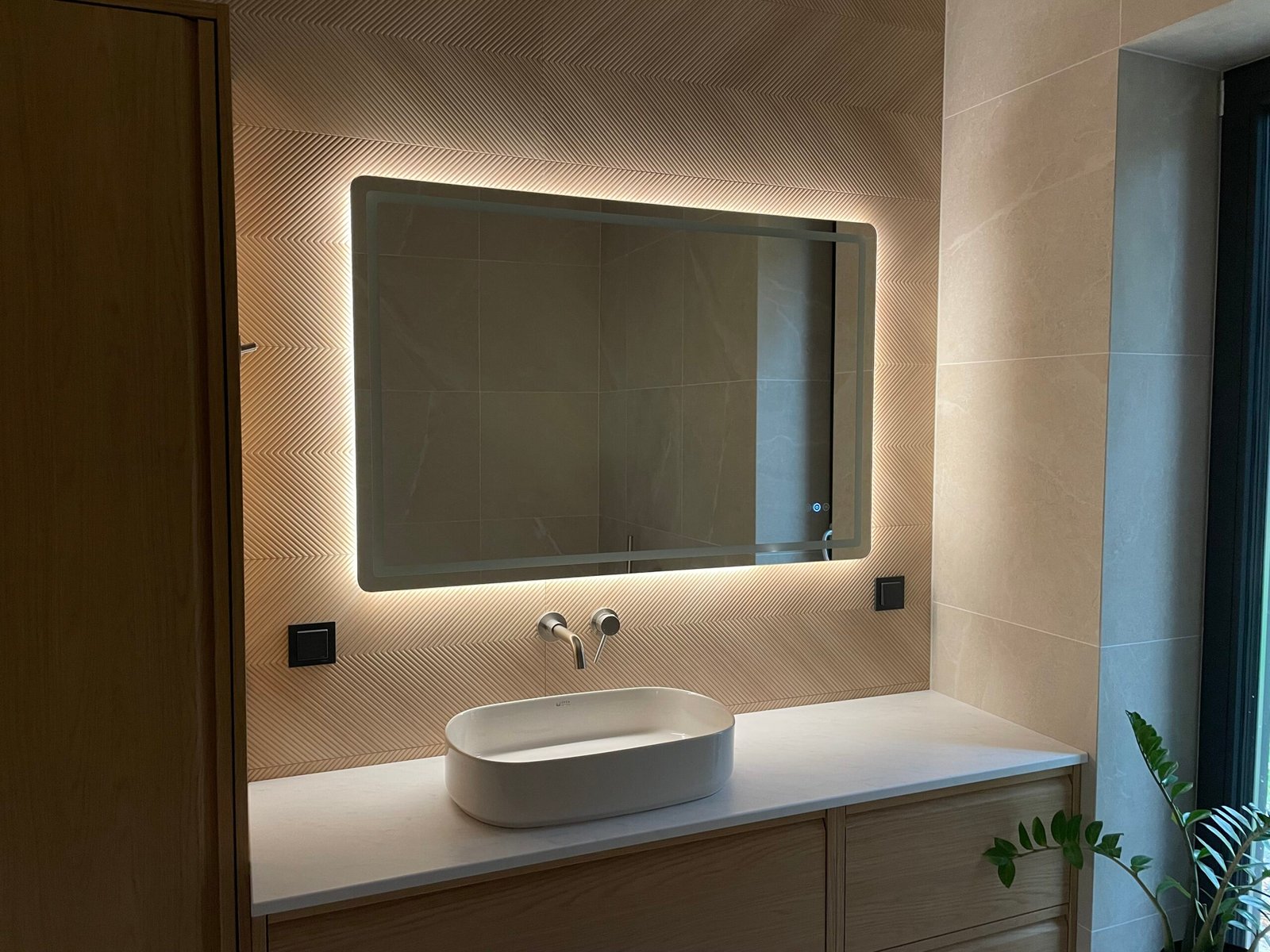 Mirror made of 5 mm high quality silver glass without copper, ar pulētām malām un antikorozijas pārklājumu. Uzticamās SMD LED joslas more than 50 000 stundas. Kvalitāti un drošību apliecina CE, ETL and RoHS Certificates.