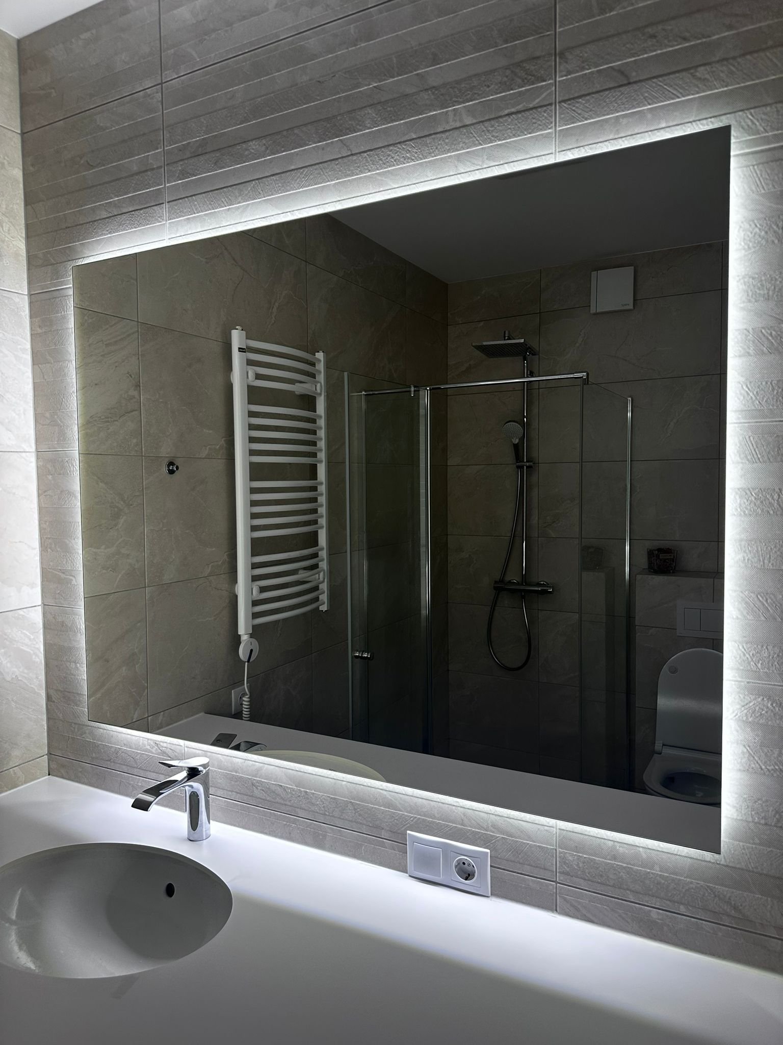 Pateicoties šādam risinājumam, LED punkti nav redzami pat skatoties no sāniem, tādēļ spogulis izskatās nevainojami no jebkura skatpunkta. Šis vieglais foniskais apgaismojums rada mierīgu atmosfēru, izceļ sienas faktūru un piešķir telpai mājīgumu.