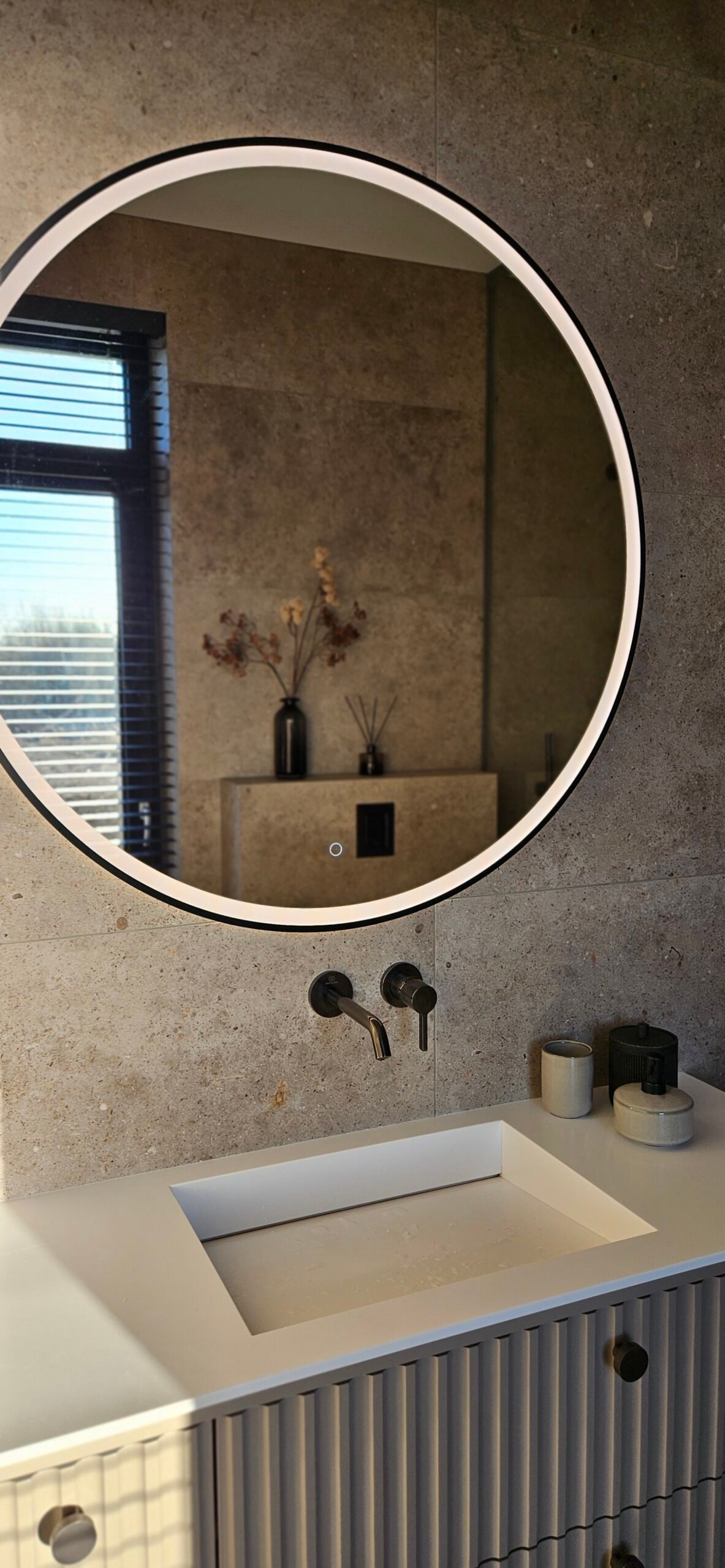 Mirror made of 5 mm high quality silver glass without copper, ar pulētām malām un antikorozijas pārklājumu. Integrētā SMD LED strip darbojas vairāk nekā 50 000 stundu, un drošību apliecina CE, ETL, RoHSCertificates.