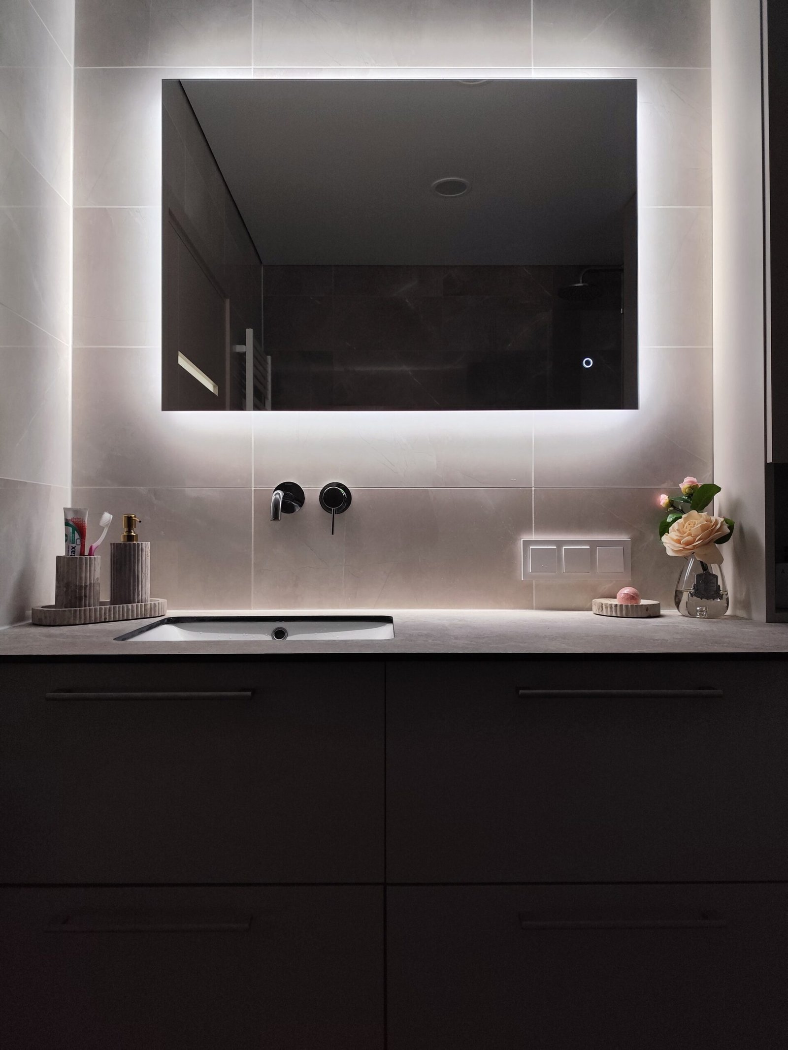 Благодаря своему дизайну, Светодиодные точки не видны ни под каким угломПоэтому зеркало выглядит эстетично, гладко и изысканно. Светлый фоновый свет подчеркивает фактуру стены, создает спокойную атмосферу и придает комнате уют.