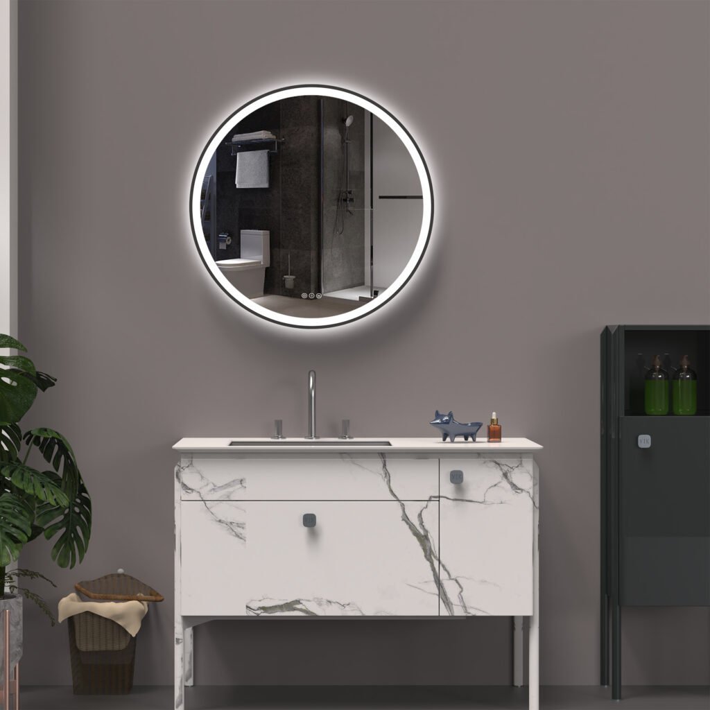 ORION 900 mm apaļais LED spogulis ar priekšējo un aizmugurējo apgaismojumu un melnu alumīnija rāmi – moderns, augstas kvalitātes un izsmalcināta dizaina risinājums jūsu vannas istabai. Šis modelis apvieno dubultā LED apgaismojuma funkcionalitāti un īpaši izturīgu, pulverkrāsotu melnu alumīnija rāmi, kas spogulim piešķir elegantu, minimālistisku raksturu.